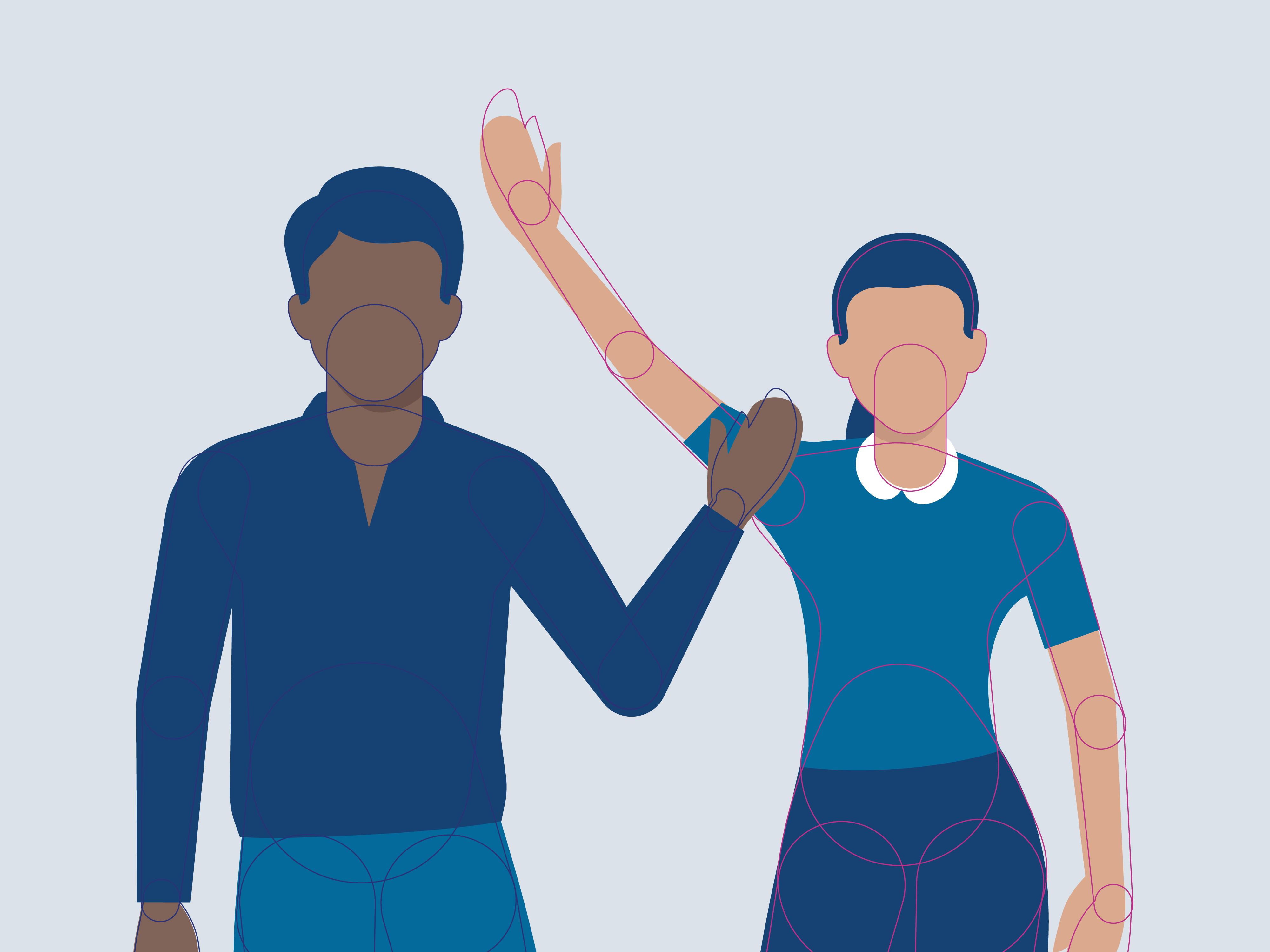 De gestandaardiseerde perspectieven en draadmodellen in de karakters lenen zich ook uitstekend voor het gebruik in animaties. Zeker bij toepassingen als explainer video's is animatie een veelgebruikte vorm. Om het juiste gebruik van de rijksbrede illustratiestijl te borgen, hebben we duidelijke richtlijnen en instructies ontwikkeld. Deze zijn via rijkshuisstijl.nl beschikbaar gesteld aan alle ontwerpers die voor de rijksoverheid werken.